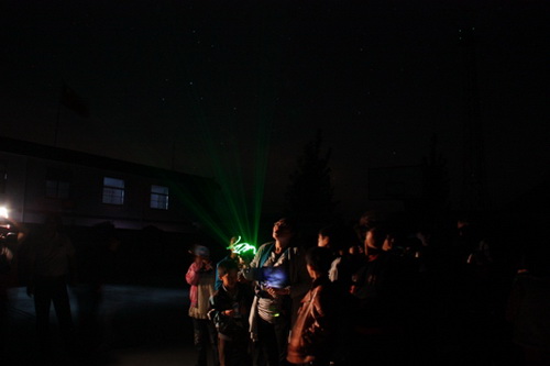 仪式结束后,学生们又来到了操场上,青岛观象台工程师张艳用指星笔引导学生观赏了壮丽的秋季银河,牛郎织女、天鹅天鹰、飞马室女,王室星座等等,悉数进入了孩子们的眼帘,不时地引起阵阵惊呼。虽然他们每天都会面对头顶上灿烂的星空,但却是第一次这么近距离的去感受星空带来的心灵震撼。在张艳耐心的讲解下,星空的神秘激发起了学生们极大好奇心,纷纷上前询问、做笔记,探索其它未知的宇宙问题。我们在做了详细的解答之后,还与学生们进行了多种互动,并现场讲解了孩子们感兴趣的天文热点事件,航天航空知识,有趣的希腊神话故事等等。