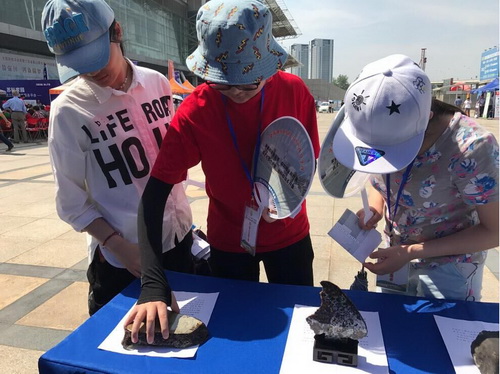 在活动现场,紫台的工作人员为南京市民带来了三块珍惜的陨石样品,分别是天长石陨石,俄罗斯Seymchan橄榄陨铁和瑞典Muonianalusta铁陨石。由于陨石是小行星、火星和月球表面的岩石,经撞击后陨落到地球上的岩石样品,它们保存了太阳系形成早期重要的物理化学条件和原始生命的信息,记录了太阳系内撞击的历史过程,是了解太阳系形成过程,探索生命起源,寻找地外生命的最关键手段之一,极具科研价值;并且它们还是从遥远神秘的太空远道而来,因此公众对陨石关注度也越来越高。展台前走过的市民看到陨石两个字,便立刻停留下来仔细观赏,伸手触摸感受这些天外来客。面对这些天外来物,市民们有一系列的疑问向我们的工作人员询问:“你们怎么知道这是陨石的”、“陨石来自哪里啊?你们是怎么寻找陨石的”、“陨石里有没有生命”、“陨石有辐射吗?”... ...。问题五花八门,各式各样,足见人们对陨石的关注。针对这些问题,紫台的陈向阳、王科超耐心地一一解答,并用通俗易懂的语言,为大家讲解了陨石的来历和特征,介绍了紫台的科研工作者研究陨石的日常工作和科研设备,使得人们对陨石和紫台的科研工作有了清晰科学的认识。