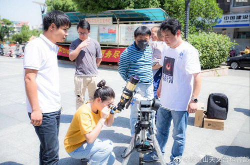 江苏南京:5月18日和5月23日,紫台工作人员在紫金山园区对前来参观的游客开展了观测太阳的活动,介绍了太阳的相关知识,紫金山天文台太阳研究及我国第一颗太阳观测卫星(先进天基太阳天文台(ASO-S)卫星)的最新进展,详细讲解了日珥镜的工作原理及使用方法,并指导游客亲自利用日珥镜来观察太阳色球层,亲眼目睹太阳黑子、暗条和日珥等。游客们不但学习了太阳知识和最新科研进展,又亲自进行太阳观测,对熟悉的太阳有了新的认识。