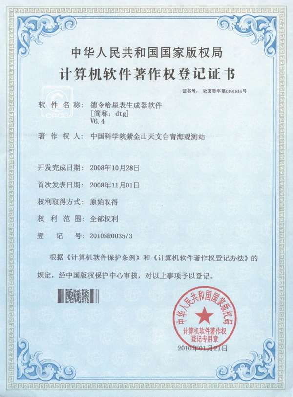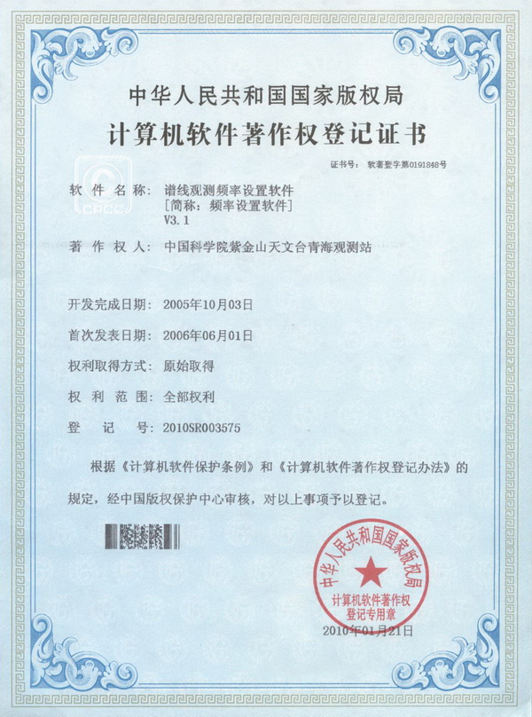 2010年1月21日,经国家版权局审核,我台青海观测站申请的《谱线观测频率设置软件〔简称:频率设置软件〕V3.1》、《德令哈星表生成器软件〔简称:dtg〕V6.4》两款软件符合《计算机软件保护条例》和《计算机软件著作权登记办法》的相关规定,被认定为原始取得;并获得国家版权局颁发的《计算机软件著作权登记证书》(编号分别为:软著登字第0191848号和软著登字第0191846号)!