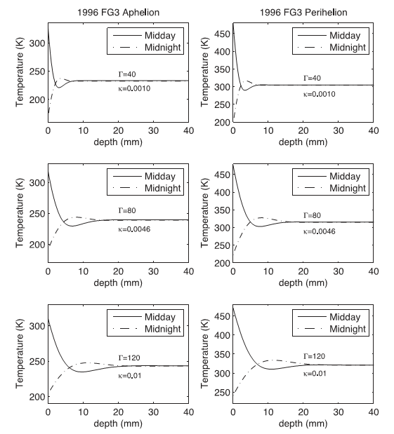 紫台研究人员选择了小行星深空探测候选目标-1996 FG3开展研究,这是一颗C型近地双小行星,具有重要的科学研究价值。对其开展相关研究,不仅有助于揭示YORP效应导致形成双小行星机制与小尺寸近地天体的来源,探索碳质球粒陨石与小行星母体的关系揭示地球生命的可能起源。在本项研究工作中,研究人员利用光学与红外天文观测数据,首先基于光学数据通过光变曲线反演法得到了该小行星的三维形状模型,并通过建立热物理模型计算得到其表面温度分布(图1)。进而利用热物理模型数值拟合多组中红外观测数据,得到了该小行星表面热惯量约为80 Jm-2s-0.5K-1、平均直径约为1.69 km、表面粗糙度约为0.8,据此推测其表面可能存在类似于月壤或Eros小行星表面的风化层,并估算了其表壤最小的厚度约为5-20 mm (图2)。这些研究工作不仅有助于深化认识小行星的热物理特性,还为未来的小行星空间探测任务提供很好的科学依据与支撑。